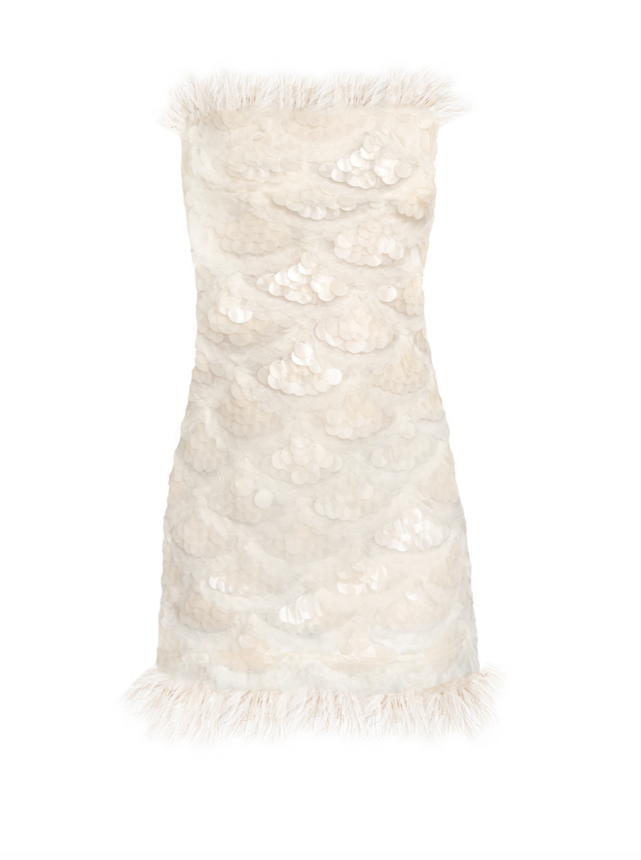 Nude strapless mini sequin dress with ostrich feathers.